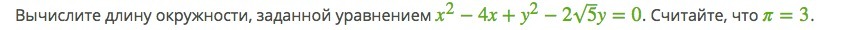 Вычислите длину окружности, заданной уравнением x2−4x+y2−25‾√y=0. Считайте, что π=3.