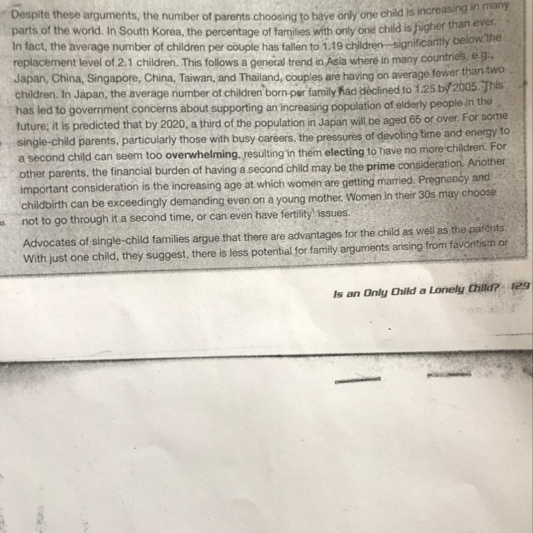Несмотря на эти аргументы, во многих частях мира растет число родителей, которые предпочитают иметь только одного ребенка. В Южной Корее, доля семей с одним ребенком выше, чем когда-либо. Фактически, среднее число детей на одну пару сократилось до 1,19 ребенка - значительно ниже уровня замещения 2,1 ребенка. Это следует за общей тенденцией в Азии, где во многих странах, например Японии, Китае, Сингапуре, Китае, Тайване и Таиланде, пары имеют в среднем менее двух детей. В Японии к 2005 году среднее число детей, рожденных в одной семье, сократилось до 1,25. Это привело к тому, что правительство беспокоится о поддержке растущего населения пожилых людей в будущем; ожидается, что к 2020 году треть населения в Японии будет в возрасте 65 лет или старше. Для некоторых родителей с одним ребенком, особенно тех, кто занят карьерой, давление, связанное с уделением времени и энергии второму ребенку, может показаться слишком огромным, в результате чего они решили не иметь больше детей. Для других родителей главным соображением может быть финансовое бремя, связанное с рождением второго ребенка. Другим важным аспектом является повышение возраста вступления женщин в брак. Беременность и роды могут быть чрезвычайно требовательными даже к молодой матери. Женщины в возрасте 30 лет могут выбирать не проходить через второй раз или даже иметь проблемы с рождаемостью.