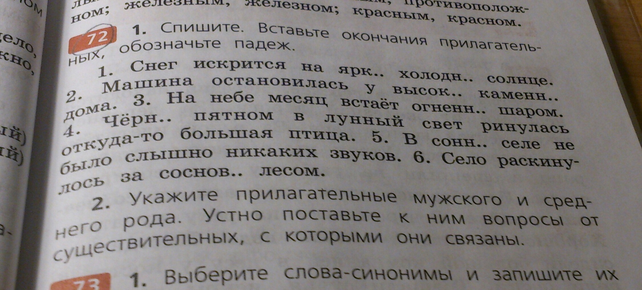 Задание: Обозначить падеж прилагательных. Подчеркнуть прилагательные мужского и среднего рода (обозначены большими буквами).Снег искрится на ЯРКОМ (п.п., с.р.), ХОЛОДНОМ (п.п., с.р.) солнце (с.р.). Машина остановилась у ВЫСОКОГО (р.п., м.р.), КАМЕННОГО (р.п., м.р.) дома (м.р.). На небе месяц встает ОГНЕННЫМ (т.п., м.р.) шаром (м.р.). ЧЁРНЫМ (т.п., с.р.) пятном (с.р.) в ЛУННЫЙ (в.п., м.р.) свет (м.р.) ринулась откуда-то большая (и.п., ж.р.) птица. В СОННОМ (п.п., с.р.) селе (с.р.) не было слышно никаких звуков. Село раскинулось за СОСНОВЫМ (т.п., м.р.) лесом (м.р.).