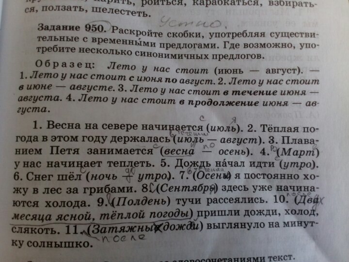 1. Весна на севере начинается с июля(в июле). 2. Тёплая погода в этом году держалась с июля по август. 3. Плаванием Петя занимается с весны до осени(с весны по осень). 4. В марте(с марта) у нас начинает теплеть. 5. Дождь начал идти с утра. 6. Снег шёл с ночи до утра(с ночи по утро). 7. В осень я постоянно хожу в лес за грибами. 8. С сентября(в сентябрь) здесь уже начинаются холода. 9. В полдень(с полдня) тучи рассеялись. 10. После двух месяцев ясной, тёплой погоды пришли дожди, холод, слякоть. 11. После затяжных дождей выглянуло на минутку солнышко.