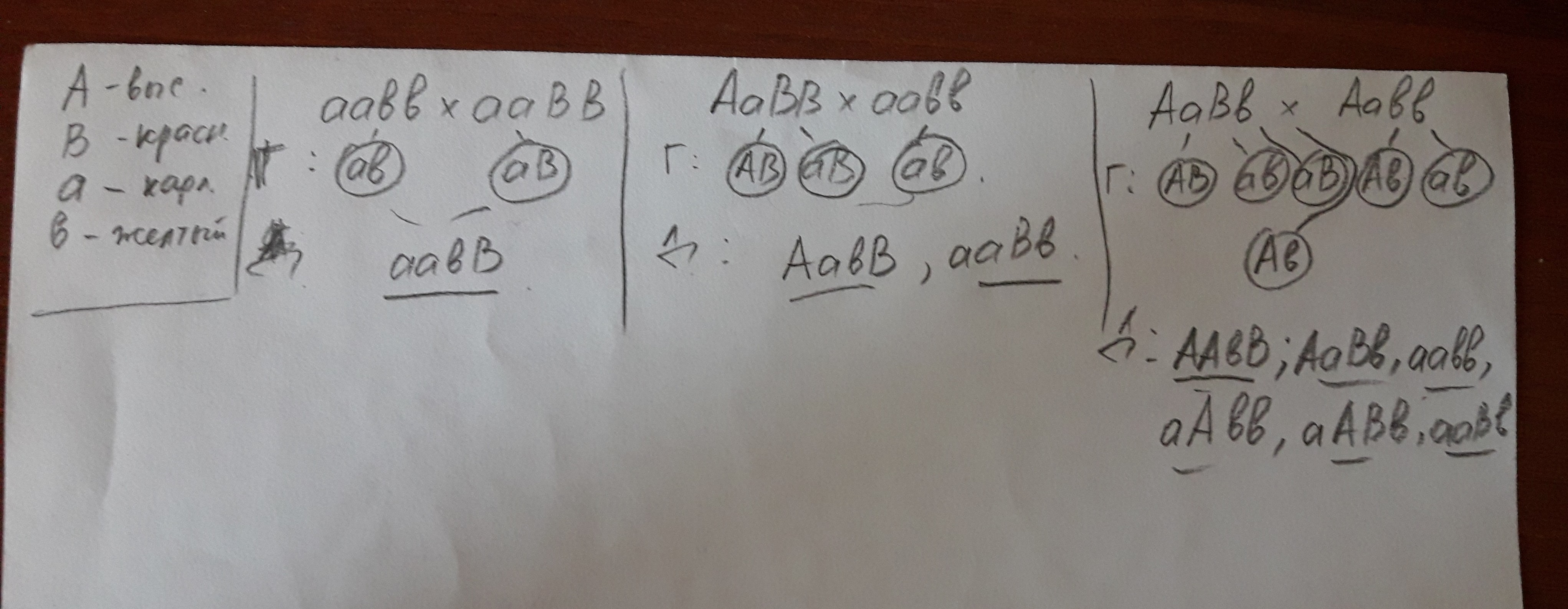 у томатов нормальная высота растений (А) и красный цвет плодов (В) являются доминантными признаками, а карликовость и желтый цвет плодов - рецесивними.Какие плоды будут иметь растения, полученные в результате скрещивания растений с генотипами: ааbb × aaBB; AaBB × aabb; AaBb × Aabb;