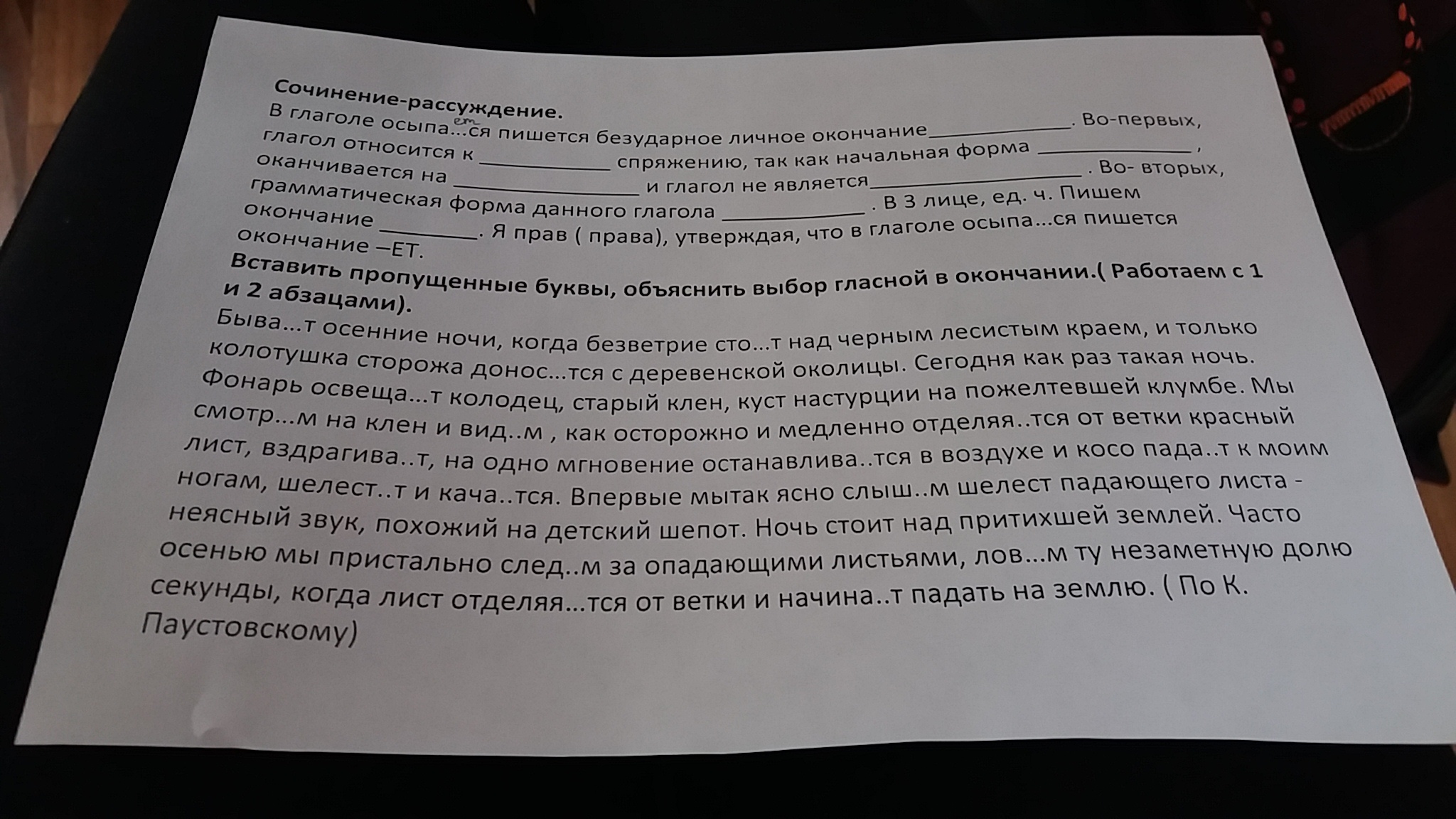 бываЮт осенние ночи,когда безветрие стоИт над черным лесистым краем, и только колотушка сторожа доносИтся с деревенской околицы.Сегодня как раз такая ночь. Фонарь освещает колодец,старый клен,куст .....Мы смотрИм на клен и видИм,как остнорожно и медленно отделяЕтся от ветки лист,вздрагиваЕт, на одно мгновение останавливаЕтся в воздухе и косо падает к моим ногам,шелестит и качается .Впервые... слышим ....Часто осенью мы пристально следим за опадающими листьями,ловим ту ....,когда лист отделяеется от ветки и начинает падать на землю.