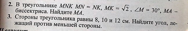 треугольник МНК равнобедренный, МН=НК, уголМ=уголК=30, уголН=180-30-30=120, МК=корень2, MK/sin120=HK/sin30, корень2/(корень3/2)=НК/(1/2), НК=2*корень2/2*корень3=корень6/3=МН, треугольник МАН, уголНМА=уголМ/2=30/2=15, уголМАН=180-120-15=45, МН/sin45=МА/sin120, (корень6/3) / (корень2/2) =МА/(корень3/2), МА=(2*корень6*корень3)/(3*корень2*2)=1