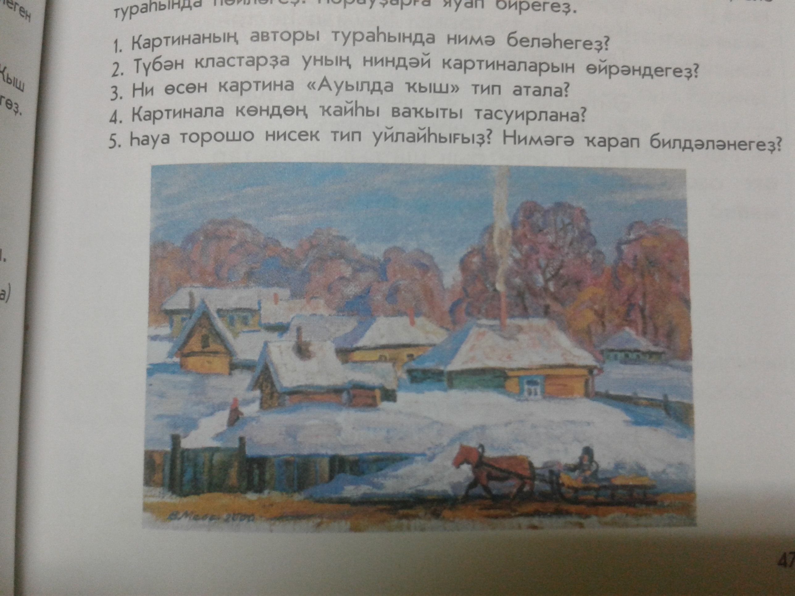 Бул картинада уйдер бар! Кыс мевсими , кар бар! Кыста аламдар уйде турадар,соуык олдан уйден шыгмайлар! Бирде бул картинада бир адам бар! Ол Атыйла бирликте бир жере кетий! Бул картина жаксы ! Себебы: кыста адамдар уйде туралар, балалар кыста ойнарлар, кыста Жана жил келир!