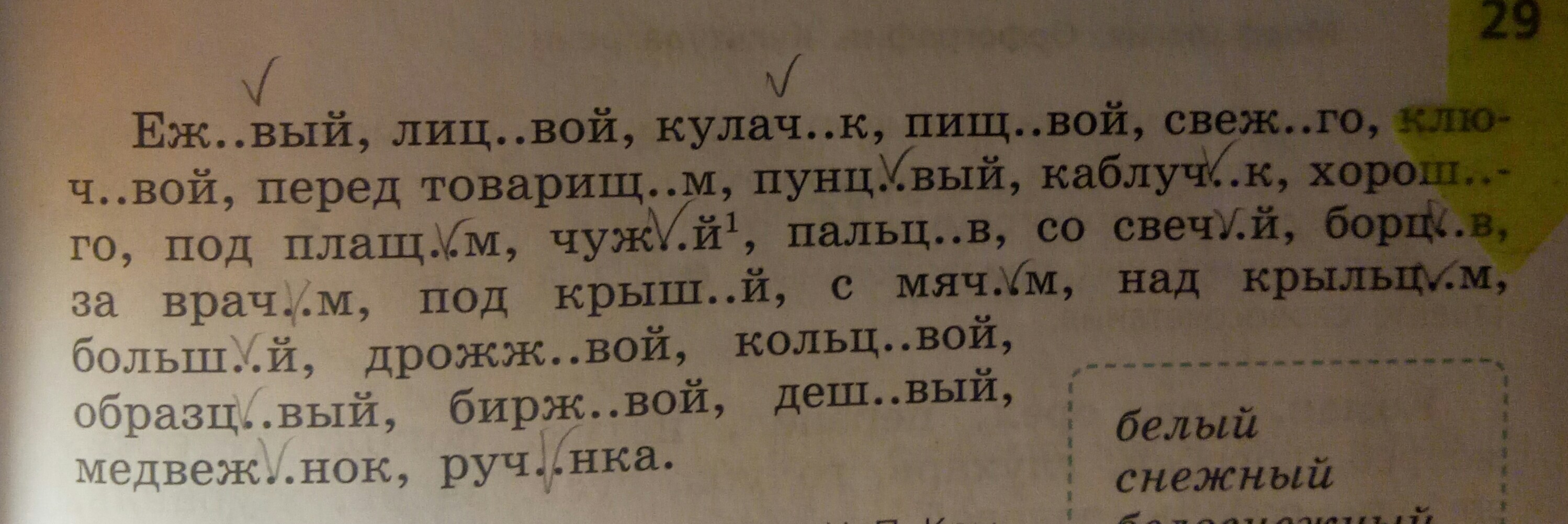 ежевый-суффикс ев, лицевой-ев, кулачок-ок, пищевой-ев, ключевой-ев, пунцовый-ов, каблучок-ок, дрожжевой-ев, колцевой-ев, образцовый-ц, ов, биржевой-ев, медведонок-онок, ручонка-онк.