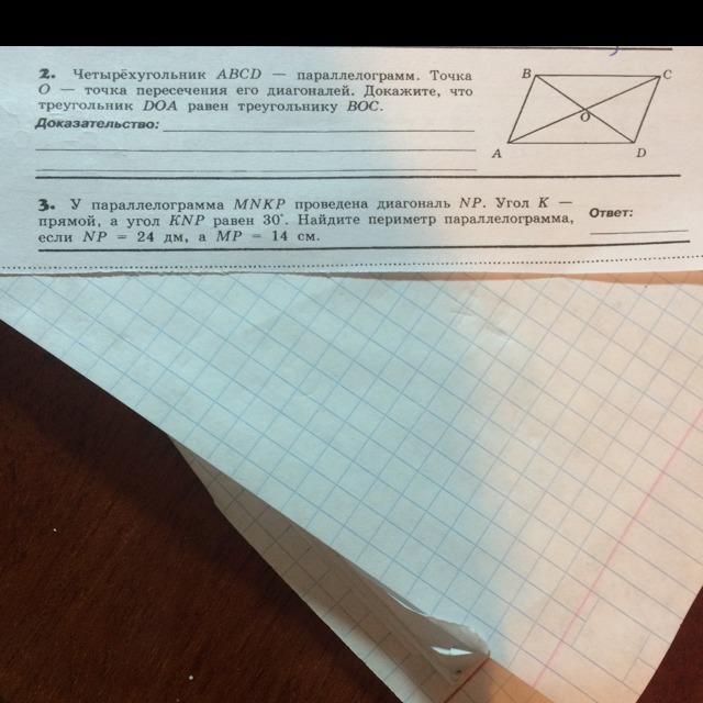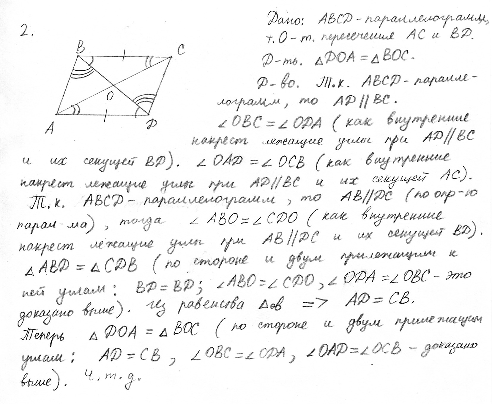 Значит, АО=ОС, ВО=OD и ВС=AD. Следовательно, треугольники ВОС и DOA равны по третьему признаку равенства треугольников (по трем сторонам) .