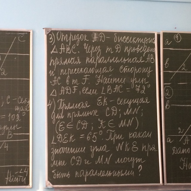 1. AD биссектриса угла BAC, значит угол DAD=36. Так как DF||AB, а AD секущая, то углы BAD и ADF накрест лежащие и равны между собой. Следовательно угол ADF=36.