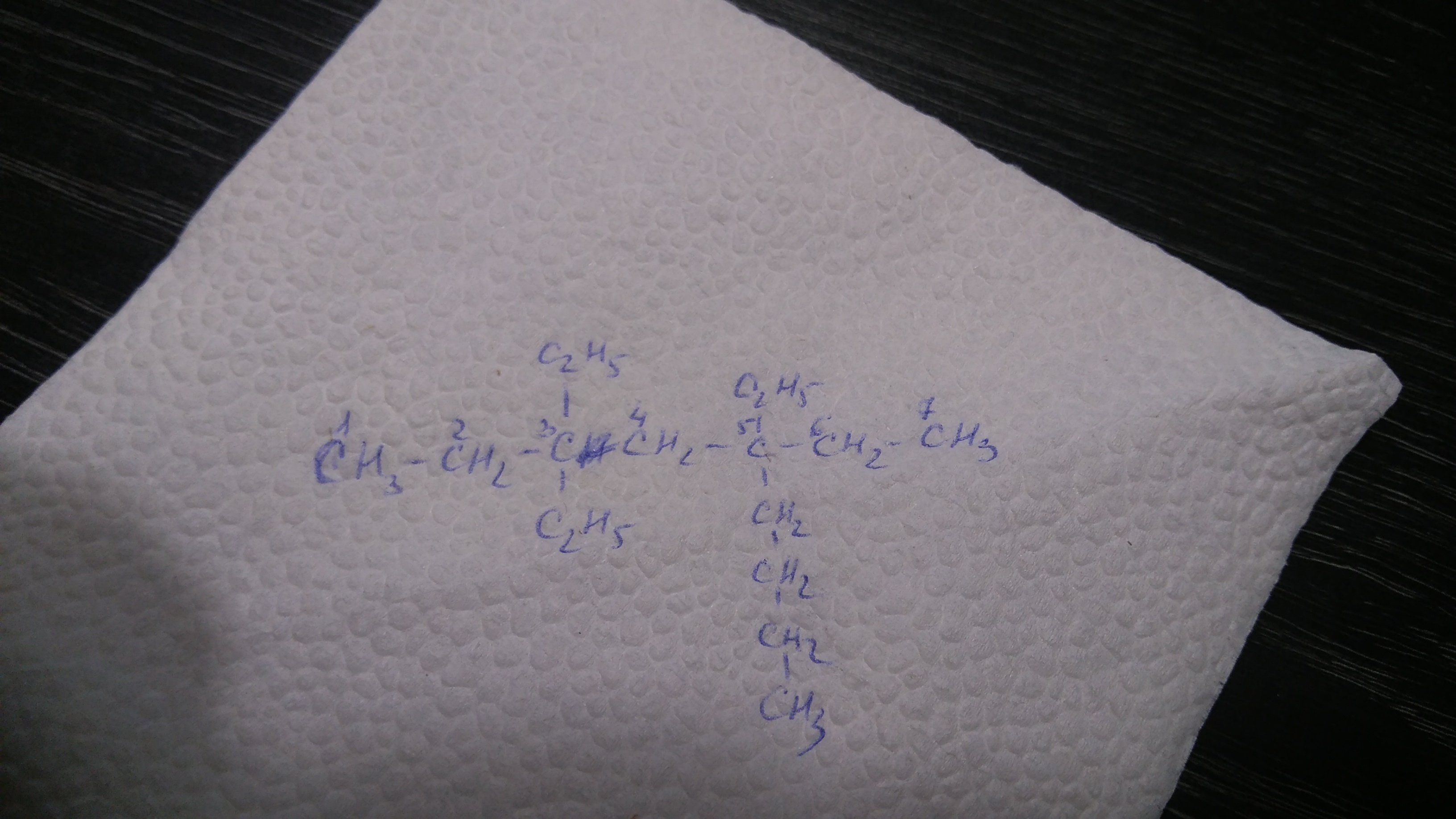 С-С-С-С-С-С-С. Дальше нумеруются атомы углерода в цепочке от одного до семи. После этого к 3-му атому углерода прикрепляем 2 этиловых радикала С2Н5 и один к 5-му атому углерода. Затем к 5-му атому прикрепляем радикал бутил С4Н7. Получится формула как на фото 1.