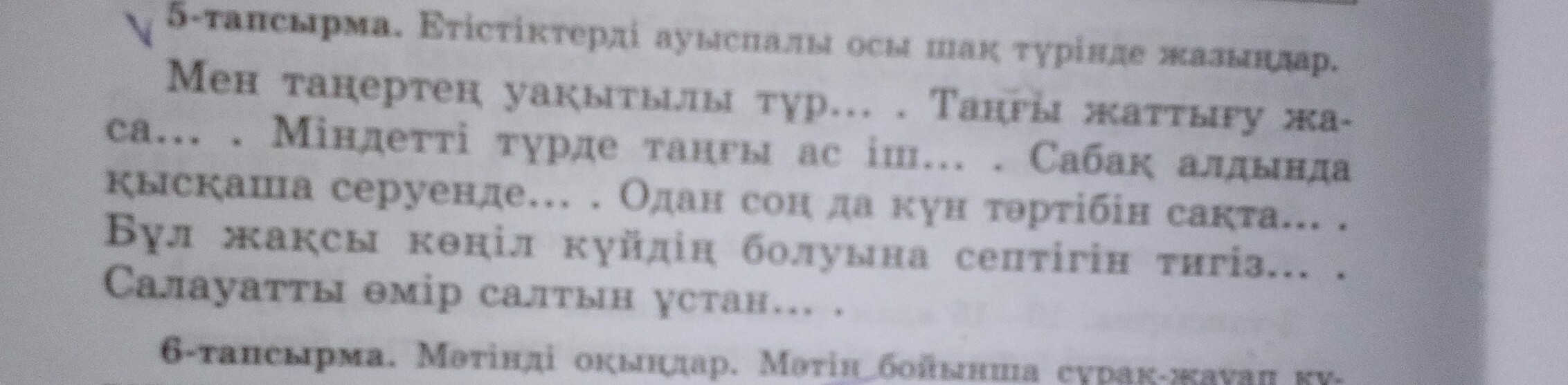 Мен таңертең уақытылы тұрамын. Таңғы жаттығу жасаймын. Міндетті түрде таңғы ас ішемін. Сабақ алдында қысқаша серуендеймін. Одан соң да күн тәртібін сақтаймын. Бұл жақсы көңіл күйдің болуына септігін тигізеді. Салауатты өмір салтын ұстанамын.