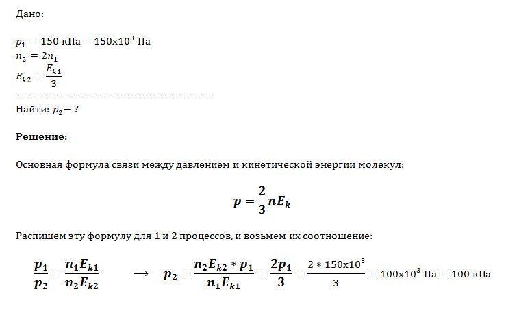 В сосуде содержится гелий под давлением 150 кПа. Концентрацию гелия увеличили в 2 раза, а среднюю кинетическую энергию теплового движения его молекул уменьшили в 3 раза. Определите установившееся давление газа.