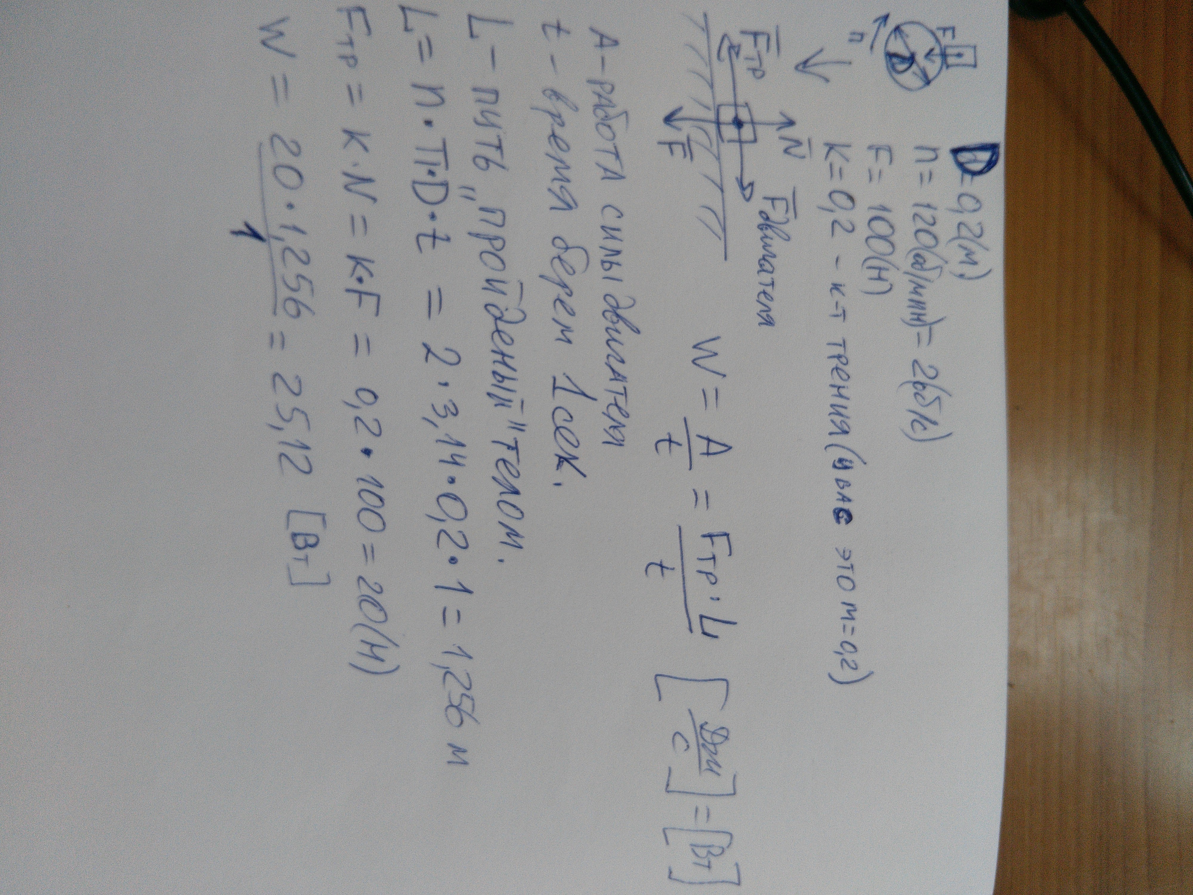 диск шлифовального станка имеет диаметр d=20 см и делает v=120 обмин. Обрабатываемая деталь прижимается к диску с силой F=100H . Какая мощность N затрачивается на шлифовку, если коэффициент трения детили о поверхность диска m=0.2 ?