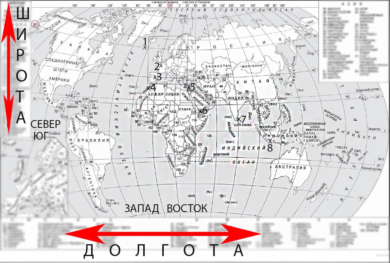 Найдите пожалуйста координаты:60°с.ш. 24°з.д.,47°с.ш.2°в.д.,40°с.ш. 4°з.д,34°с.ш. 8°з.д,30°с.ш 32° в.д.,16°с.ш44°в.д.,7°с.ш 80° в.д,7°ю.ш. 107°в.д