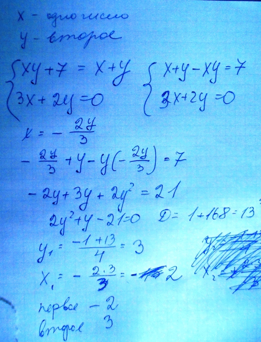 Добуток двох чисел на 7 менший від суми цих чисел а сума потроїного першого числа і подвоєного другого дорівнює 0. Знайдіть ці числа.