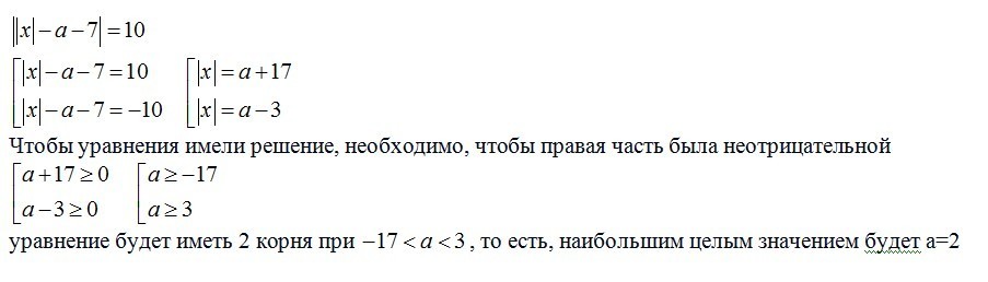 При каком наибольшем целом значении a уравнение | |x| -a-7| =10 имеет ровно 2 корня?