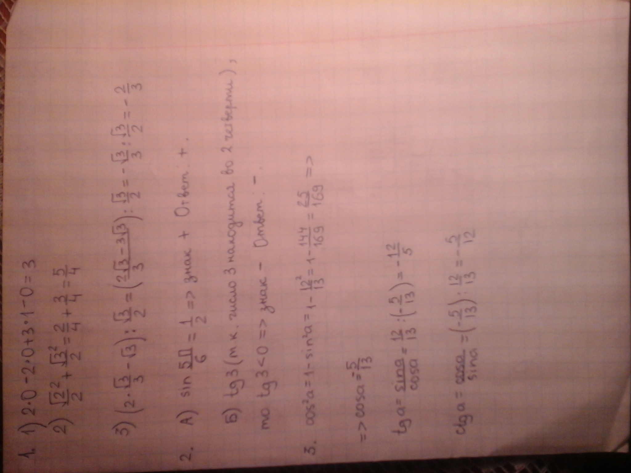 1) 2sin π - 2cos 3π/2 + 3tg π/4 - ctg π/2