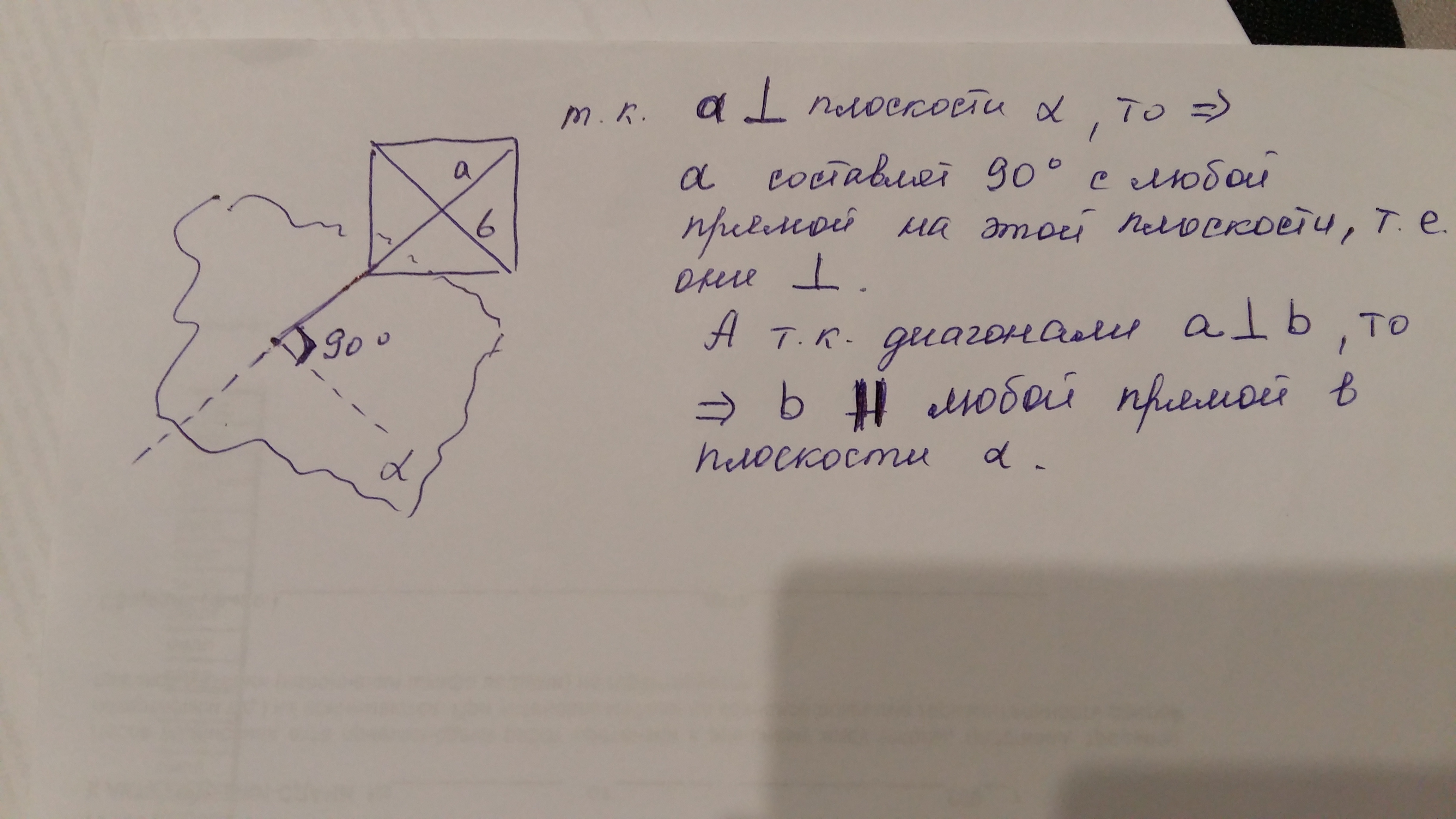 Т.к. прямая а⊥плоскости α, то следовательно угол между а и любой прямой на этой плоскости = 90°, т.е. они лежат во взаимно перпендикулярных плоскостях. Т.к. диагонали квадрата пересекаются под углом 90°, то след. диагональ b лежит в плоскости параллельной плоскости α.