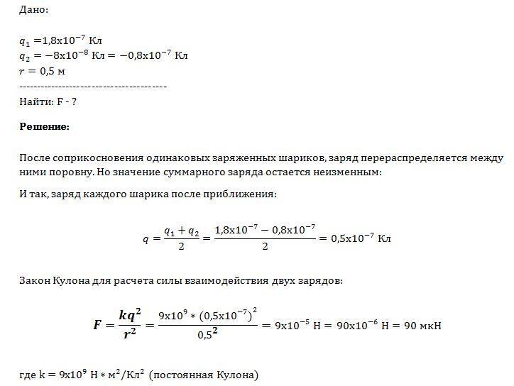 Два одинаковых маленьких шарика с зарядами 1,8·10-7 Кл и - 8·10-8 Кл приведены в соприкосновение и вновь раздвинуты на расстояние 0,5 м. Определите силу взаимодействия между ними.
