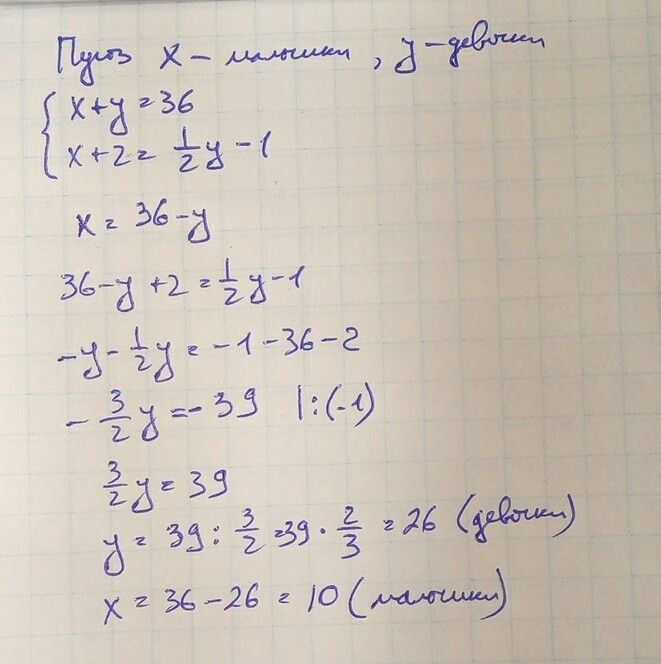 В класс 36 девочек и мальчиков. Если бы мальчиков было еще 2, то их бы было на 1 менише чем половина дквочек. Сколько девочек и мальчиков в классе?