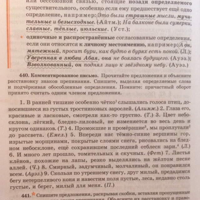 1. В ранней тишине особенно чётко слышались голоса птиц, доносившиеся(какие?) из густых тростниковых зарослей(причастный оборот). 2. Глаза его, красивые и ласковые, смотрели как-то грустно. 3. Цвет небосклона, лёгкий, бледно-лиловый, не изменяется во весь день и кругом одинаков. 4. Промокшие(какие?) и промёрзшие(какие?)(причастный оборот), мы проплутали до рассвета. 5. Впереди нас тёмно-синие вершины гор, изрытые морщинами, покрытые слоями снега, рисовались на бледном небосклоне, ещё сохранившем(каком?) последний отблеск зари(причаст. оборот). 6. И много лет прошло, томительных и скучных. 7. Листья клёнов, похожие на лапы, резко выделялись на жёлтом песке аллей. 8. Смирный, задумчивый, молчаливый, он понравился всем. 9. Скользя(что делая?) по утреннему снегу(деепричастный оборот), друг милый, предадимся бегу нетерпеливого коня и навестим поля пустые, леса, недавно столь густые, и берег, милый для меня.