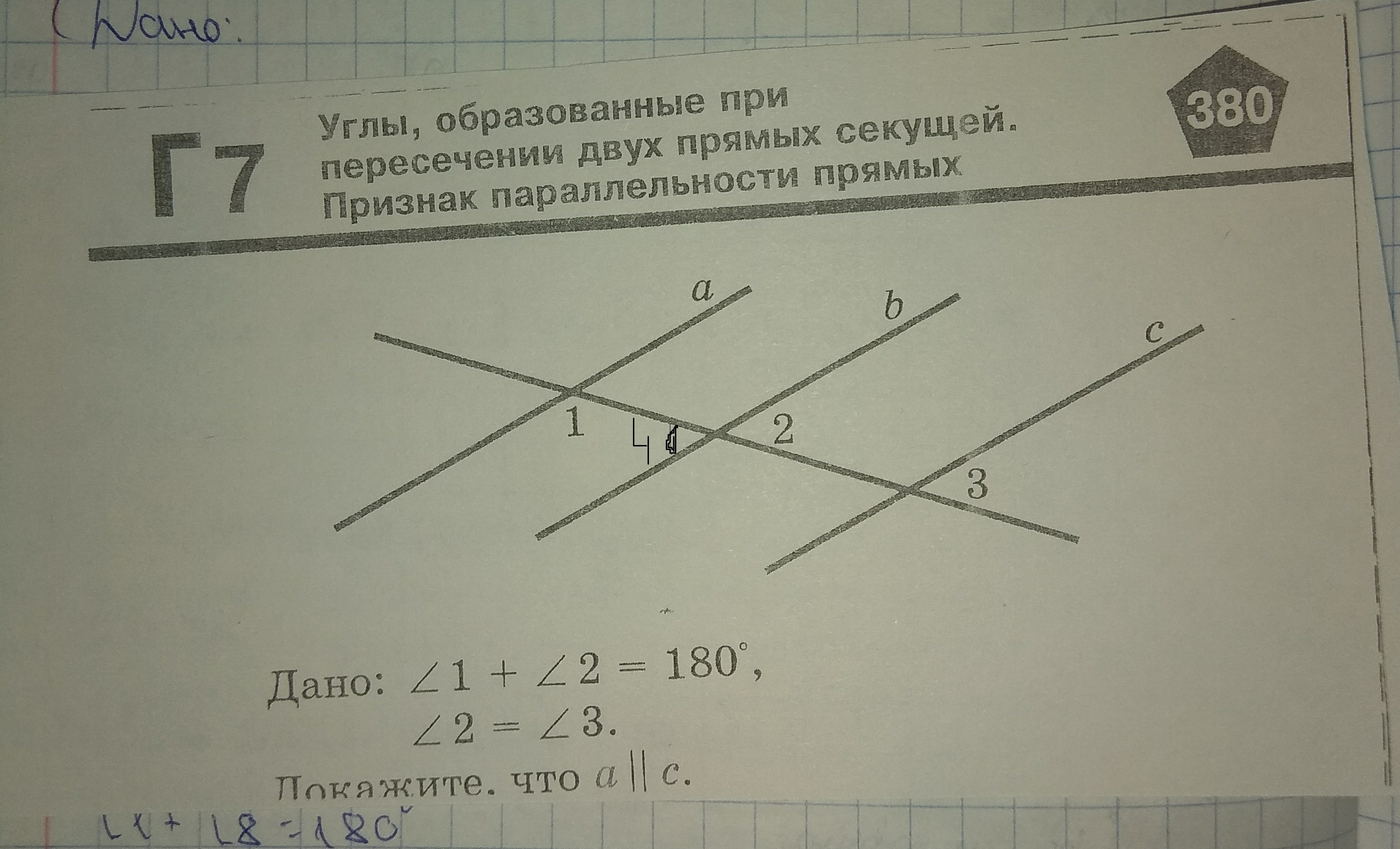 если угол1 + угол2 = 180 градусов, и угол4 +угол 1=180 градусов, то прямые а и в параллельны. а т к в параллельно с, то следуя из признака параллельности прямых, получается, что а параллельно с, чтд
