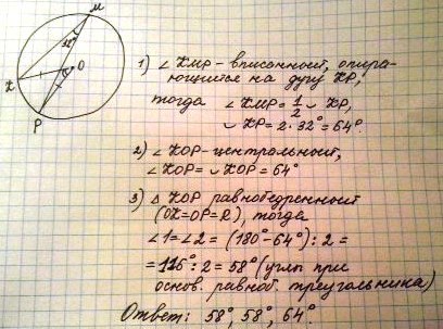 В окружность с центром O вписан угол KMP,равный 32 градуса (точки K и P лежат на окружности). Найдите углы треугольника OKP