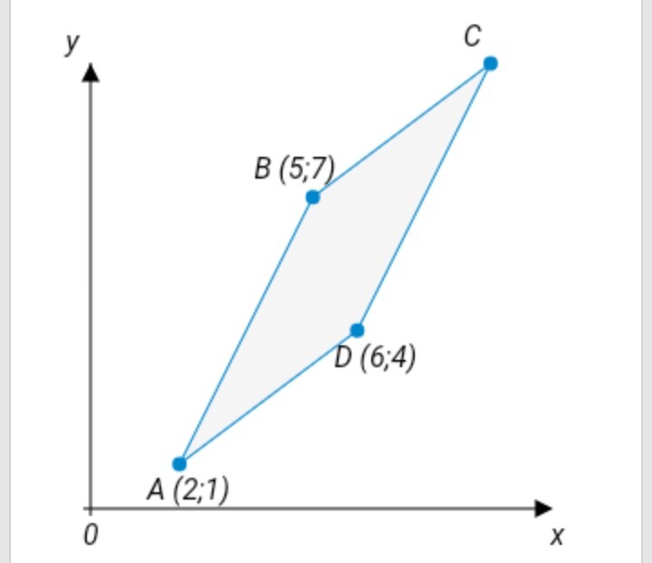 Дан параллелограмм ABCD. Три его вершины имеют координаты: A(2;1), B(5;7), D(6;4).