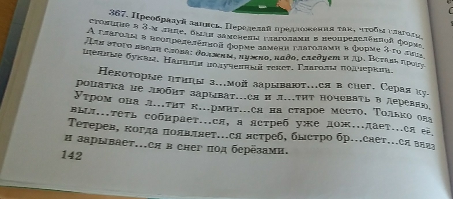 некоторые птицы зимой зарываются в снег.Серая куропатка не любит зарываться и летит ночивать в деревню.Утром она летит кормиться на старое место.Только она вылететь собирается,а ястреб уже дожидается её.Тетерев,когда появляется ястреб ,быстро брасается вниз и зарывается в снег под берёзами.