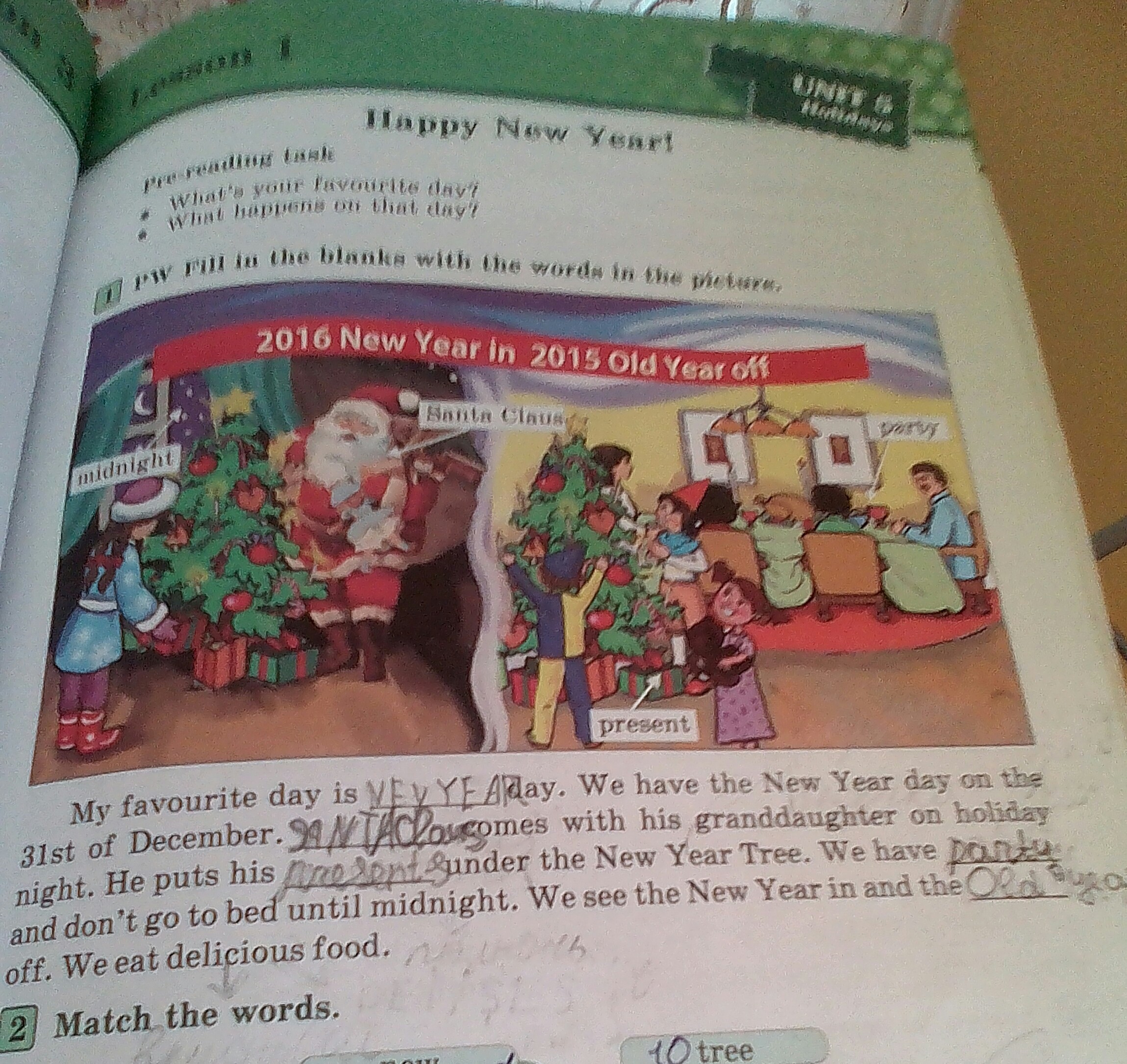Мой любимый день - Новый год. У нас Новый год 31 декабря. Дед Мороз приходит с его внучкой на праздник ночью. Он кладет его подарки под ёлку. Мы празднуем и не ложимся спать после полуночи. Мы видим Новый год .............(не поняла слово). Мы едим приятную (вкусную) еду.