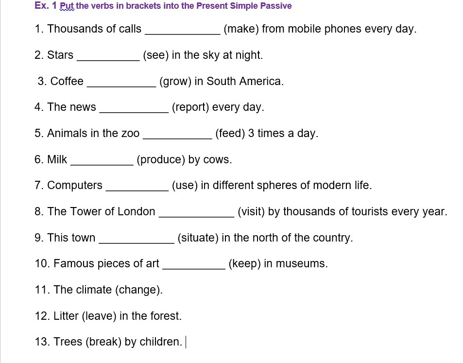 1 are made 2 are seen 3 is grown 4 is reported 5 are fed 6 is produced 7 are used 8 is visited 9 is situated 10 are kept 11 is changed 12 is left 13 are broken