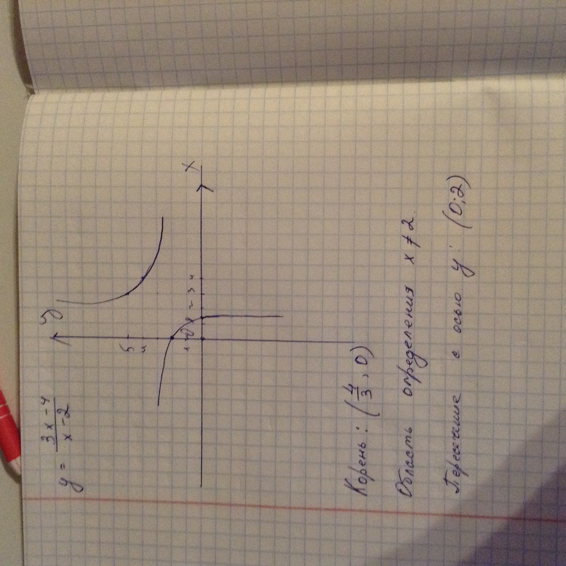 Корень 4/3, область определения икс не равен 2. Пересечение с осью у (0;2)