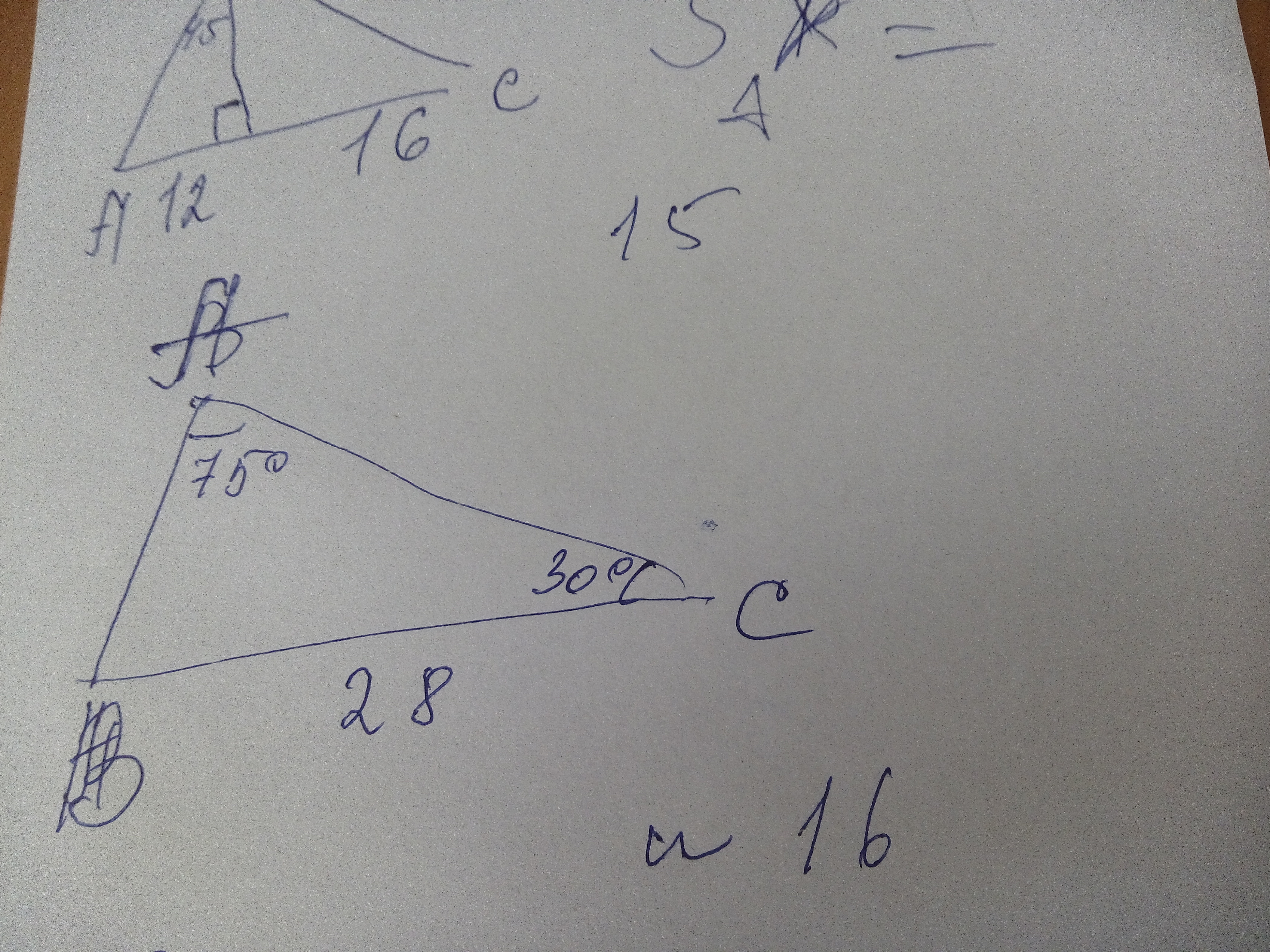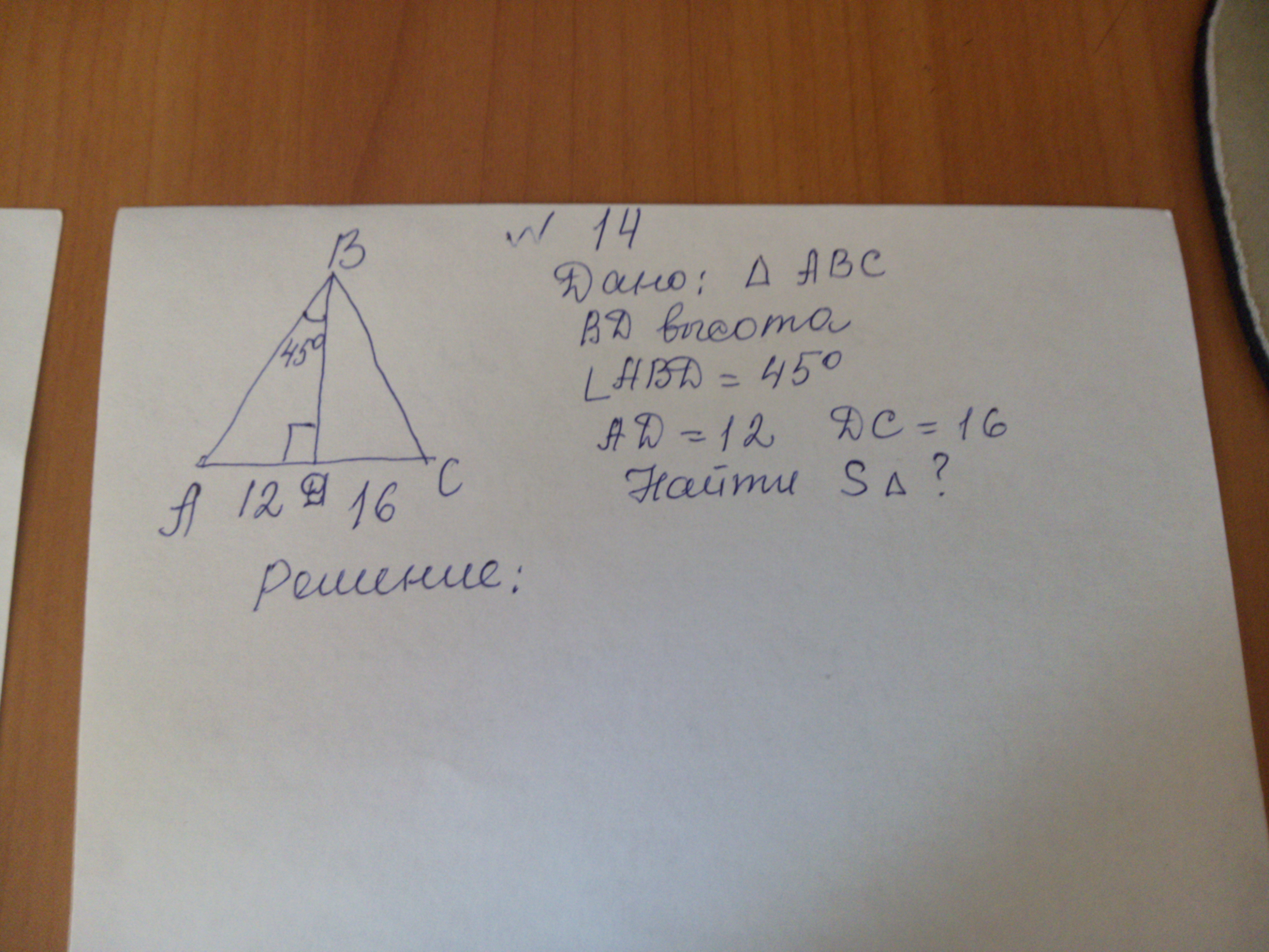 14) По сумме острых углов прямоугольного треугольника, А=90°-АВД=90°-45°=45°, тогда А=АВД=45°, значит, по признаку равнобедренного треугольника, треугольник АДВ - равнобедренный(ДВ=АД=12), поэтому АС=АД+ДС=12+16=28, и S ABC=AC*BD/2=12*28/2=168