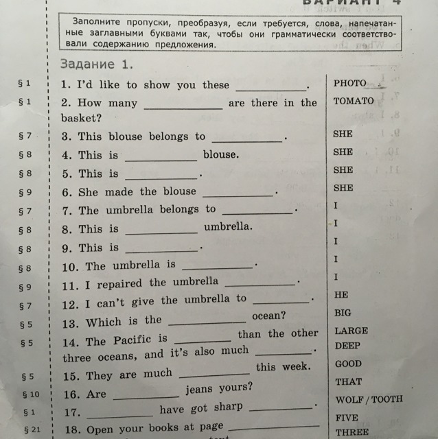 1. photos2. tomatoes3. her4. her5. her 6. by herself7. me8. my9. meine10. my11. by myself12. him13. biggest14. larger, deeper15. 16. 17. 18.