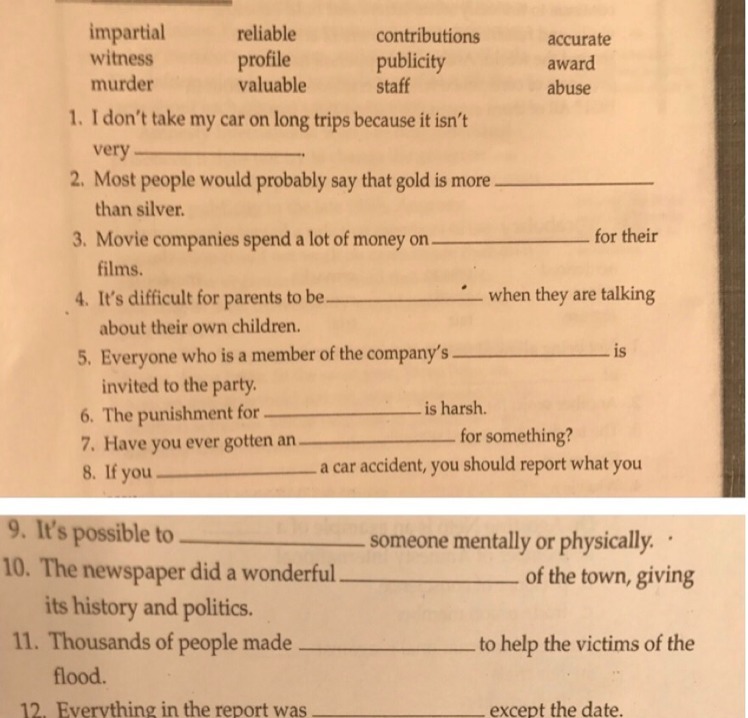 1. reliable, 2. valuable, 3. publicity, 4. impartial, 5. staff, 6. murder, 7. award, 8. wittness. 9. abuse, 10. profile. 11. contributions. 12. accurate.