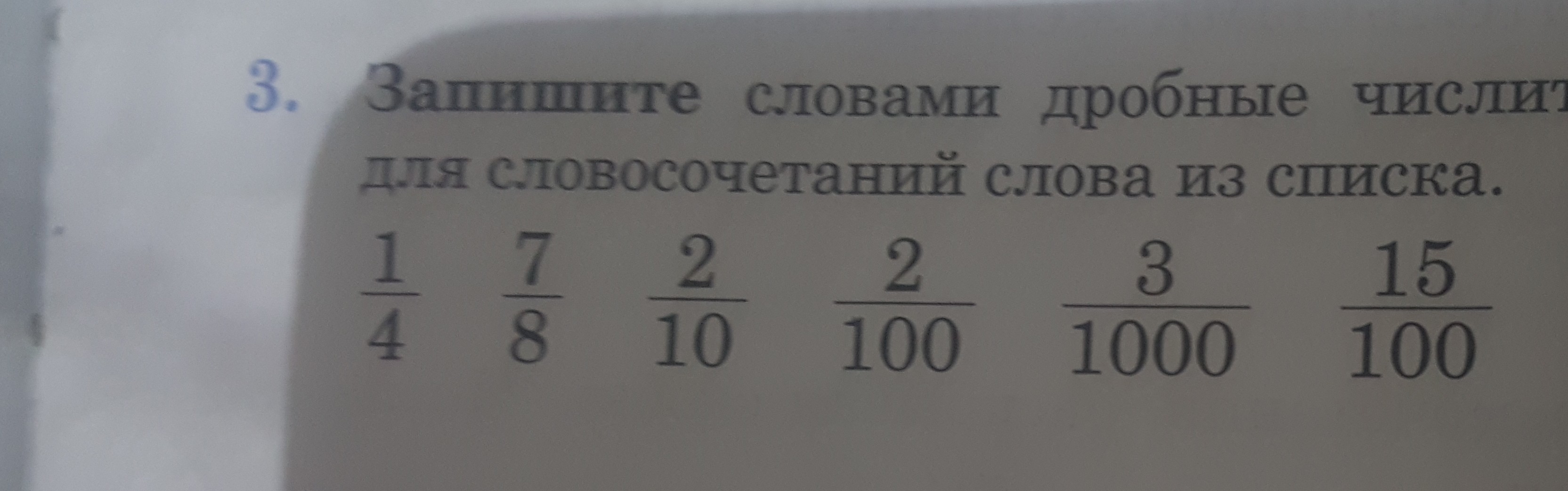 одна четвертая, семь восьмых, две десятых, две сотых, три тысячных, пятнадцать сотых