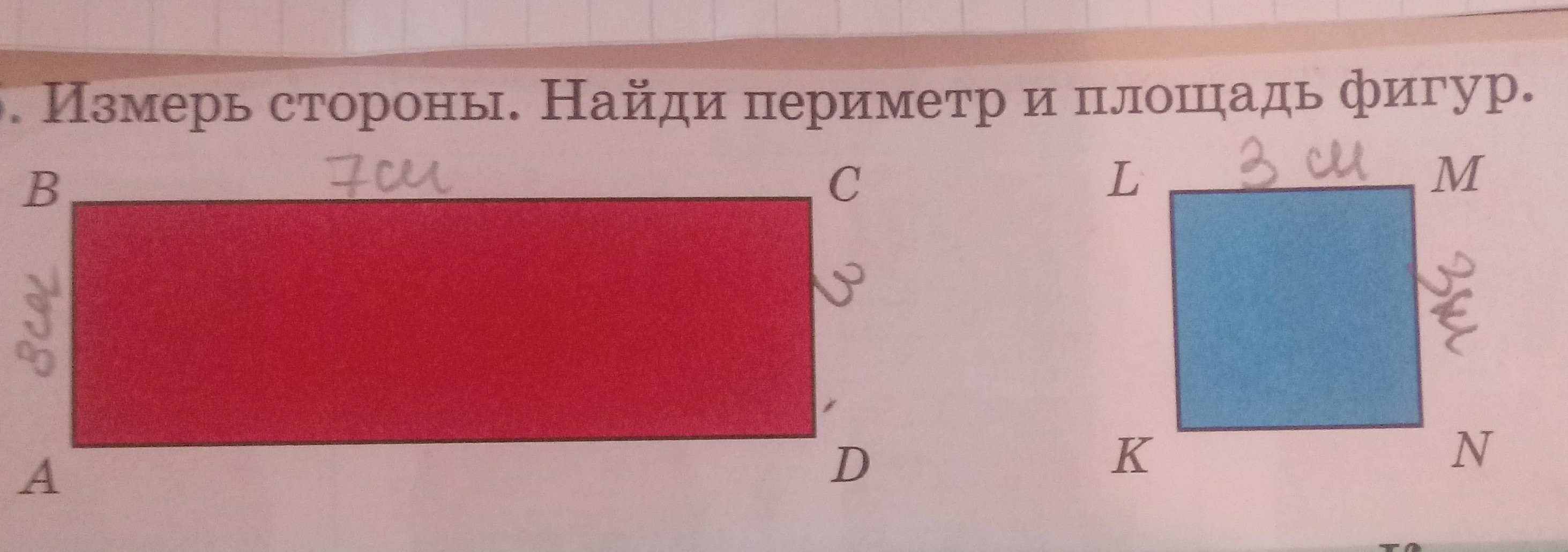 Первая фигура:перим.=26см., пл. 21 кв см. Вторая фигура: перим.= 12см.,пл.9см кв