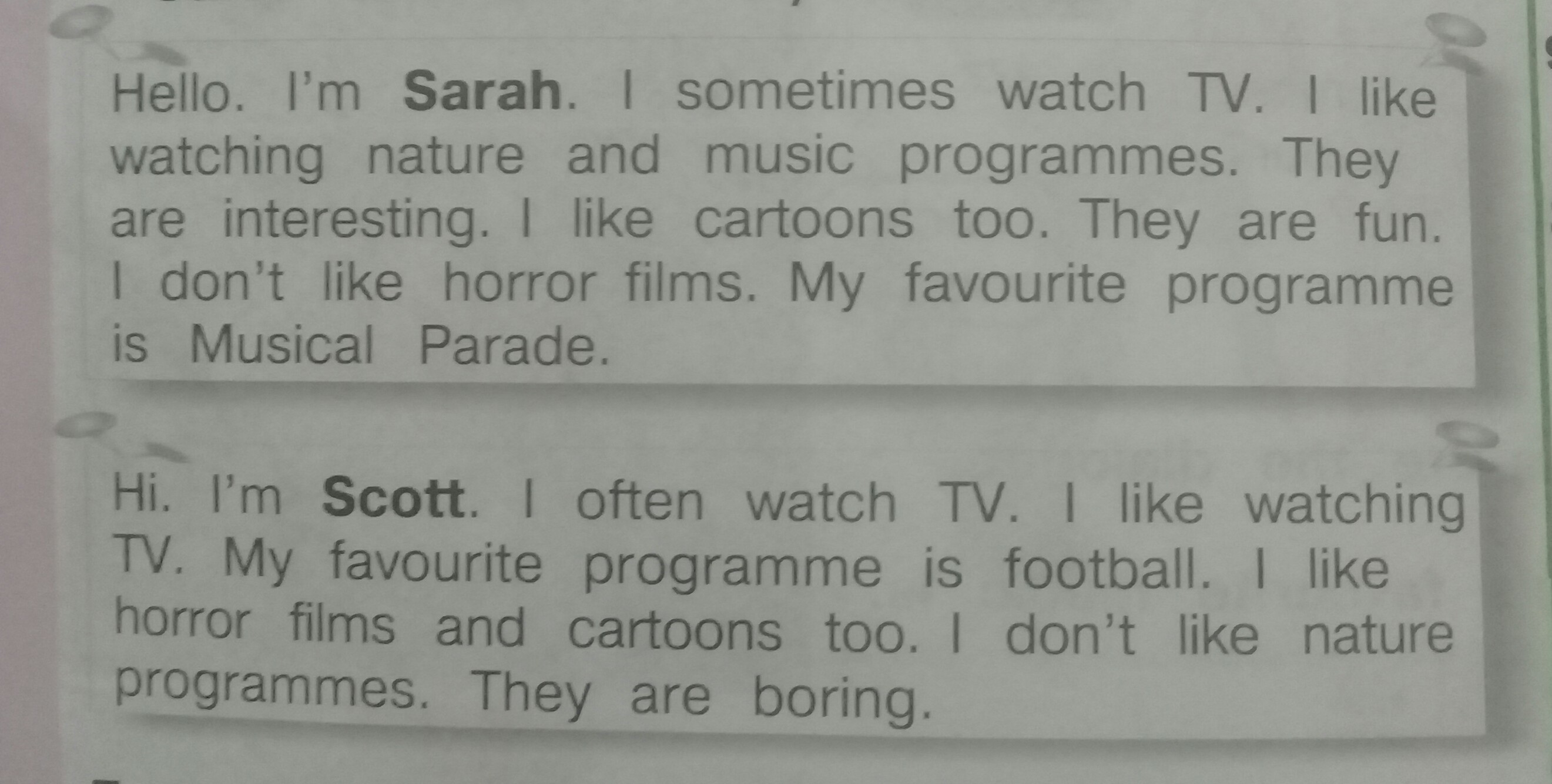 Привет! Я Скотт. Я часто смотрю телевизор. Мне нравится смотреть телевизор. Моя любимая программа о футболе. Мне нравятся "ужастики", а также мультфильмы. Мне не равятся программы о природе. Они скучные.