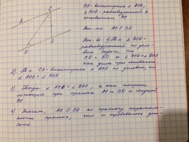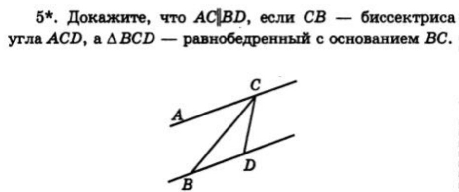 Докажите, что AC || BD, если СВ — биссектриса угла ACD, а треугольник BCD — равнобедренный с основанием BC