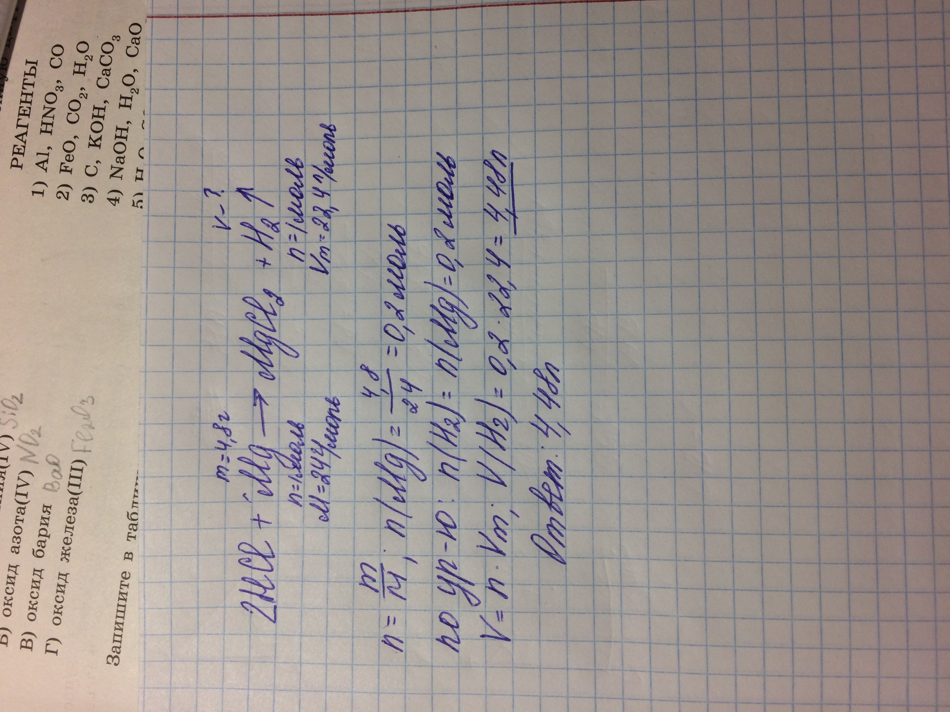 Определите объем водорода (н.у.) который выделится в результате реакции замещения между соляной кислотой и 4,8 г магния