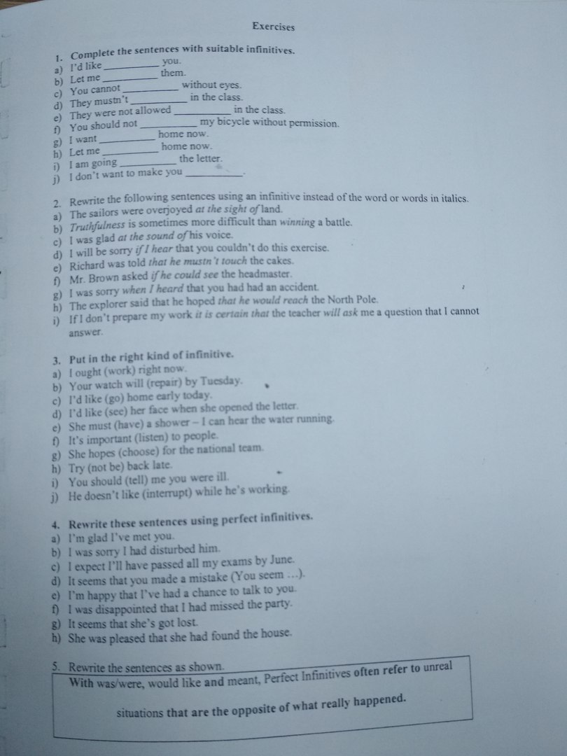 a) I'm glad to have met you,b) I was sorry to have disturbed him,c) I expect to have passed all my exams by June,d) You seem to have made a mistake,e) I'm happy to have had a chance to talk to you,f) I was disappointed to have missed the party,g) She seems to have got lost, h) She was pleased to have found the house