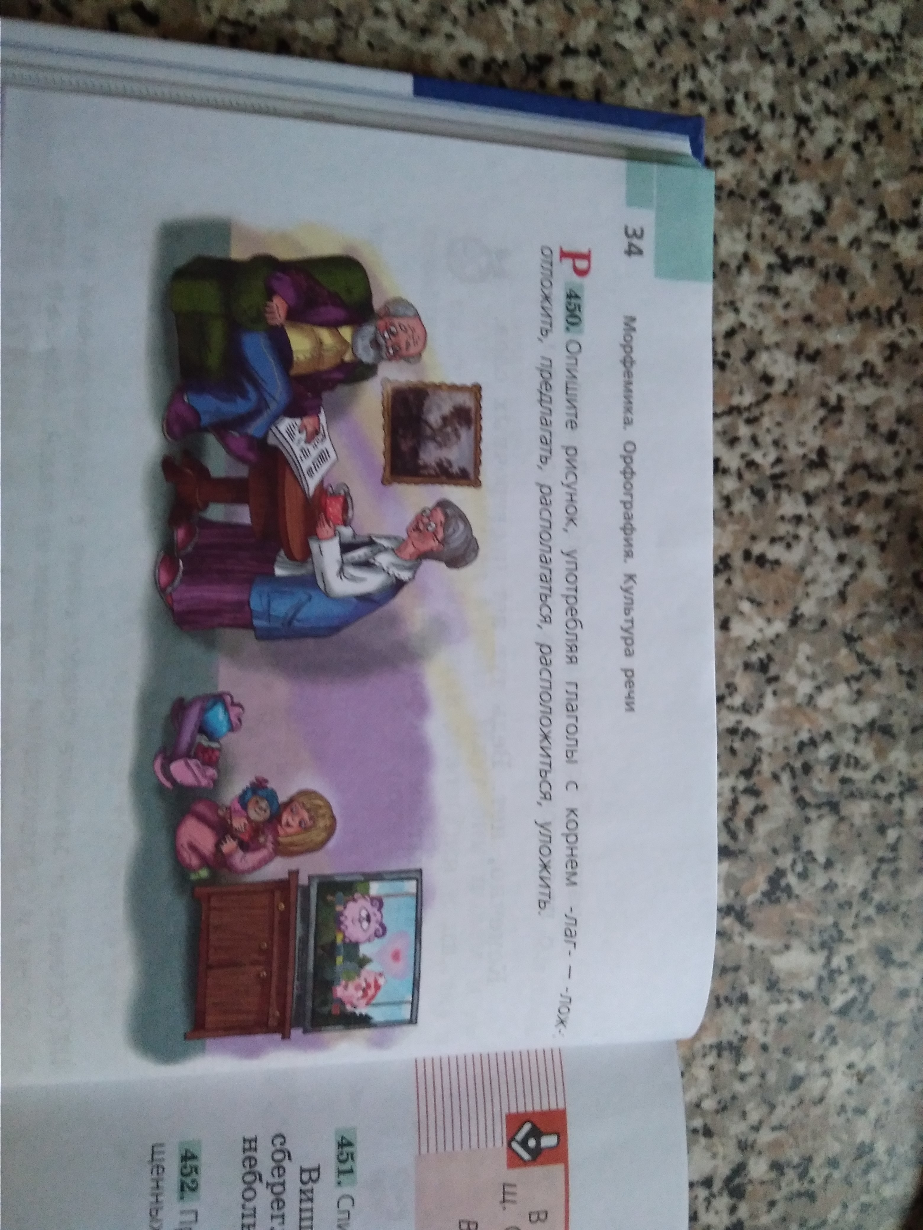 на рисунке изображена семья,которая расположилась в гостиной.Дедушка отложил газету и уютно расположился в кресле.