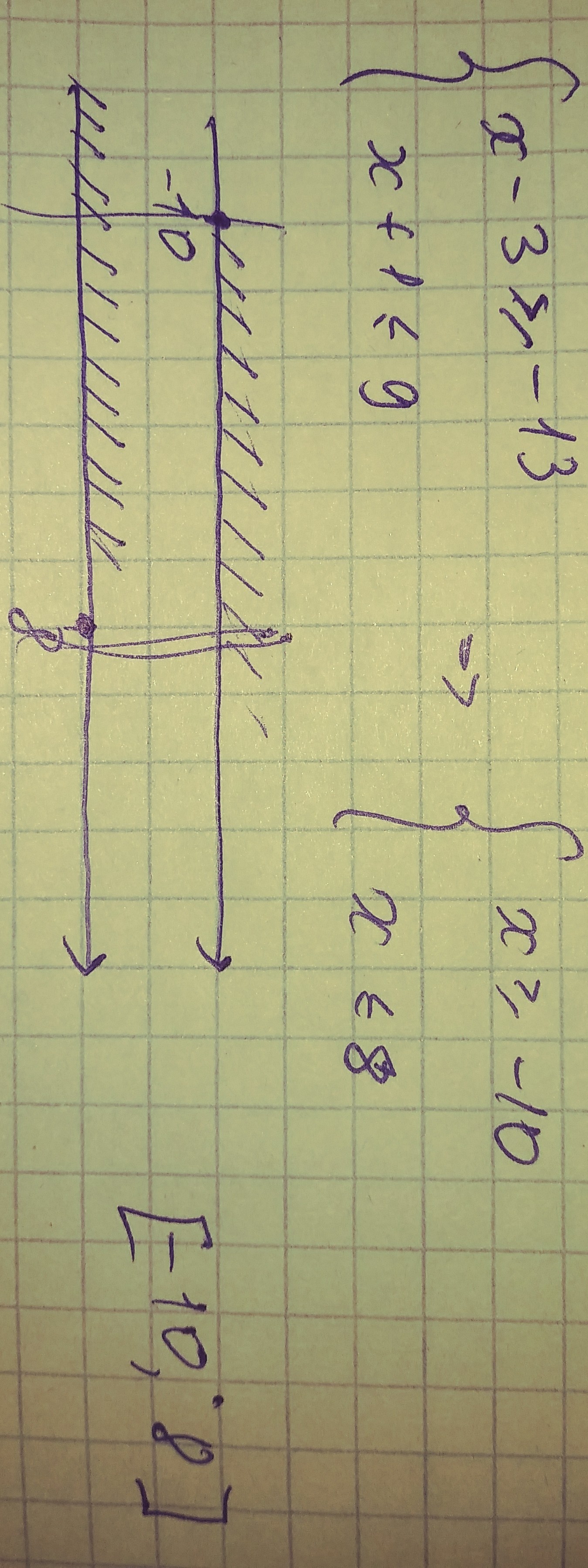 Решите неравенство и изобразиье множество его решений на коордиратной прямой: х-3>или=-13; х+1<или=9; в