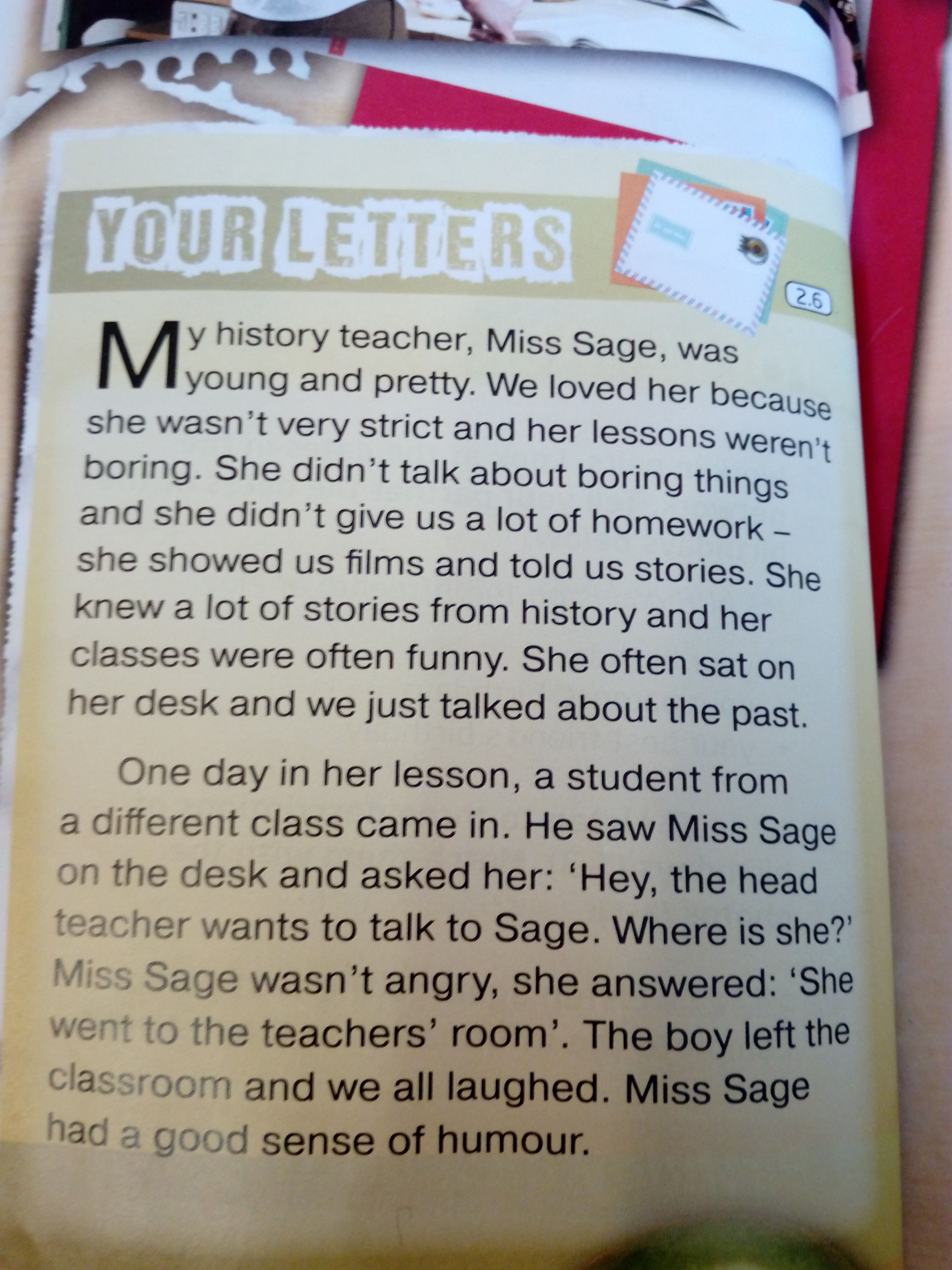 Моя учительница истории Мисс Сэйдж была молода и красива. Мы её любили, потому что она не была очень строгой и её уроки не были скучными. Она не рассказывала нам скучные вещи и не задавала много домашнего задания - она показывала нам фильмы и рассказывала истории. Она знала много историй и на её уроках часто было весело. Часто она сидела за партой и просто рассказывала о прошлом.