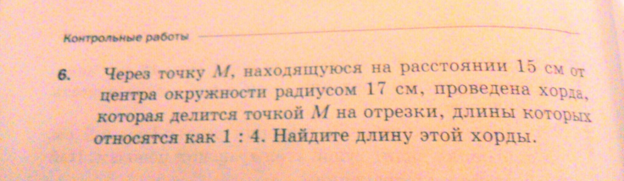 Через точку М проведём диаметр АВ, который точкой М делится на отрезки АМ = 17 + 15 = 32см и ВМ = 17 - 15 = 2см