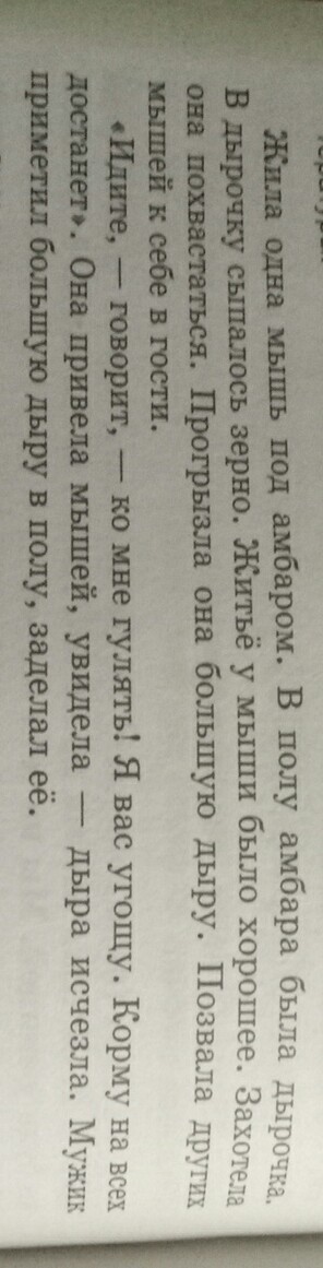 Жила одна мышь под амбаром. В полу амбара была дырочка, а в эту дырочку сыпалось зерно. Житье у мыши было хорошее.
