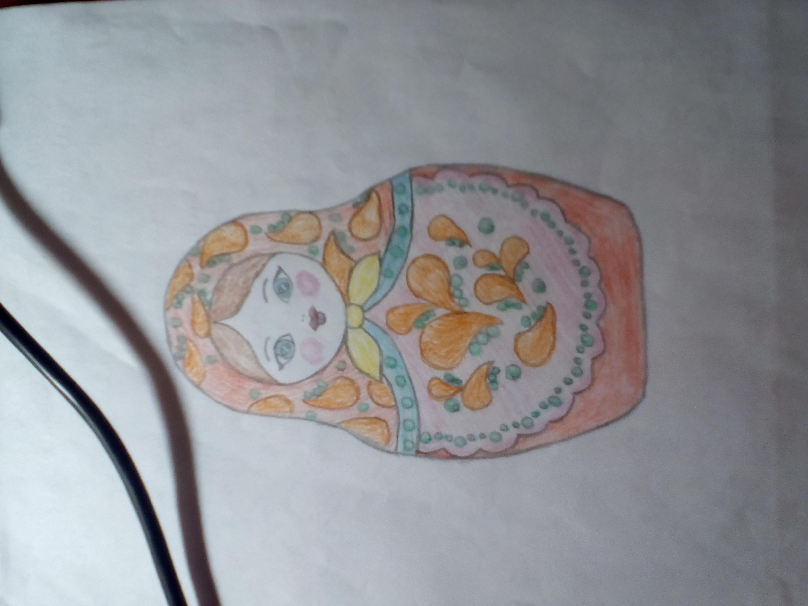 Моя мотрёшка розово-красно-оранжевых оттенках. Она большая и красивая! На ней много узоров и мелких деталей. На матрёшке зелёное кружево. Сочетание всех цветов предаёт характер матрёшке
