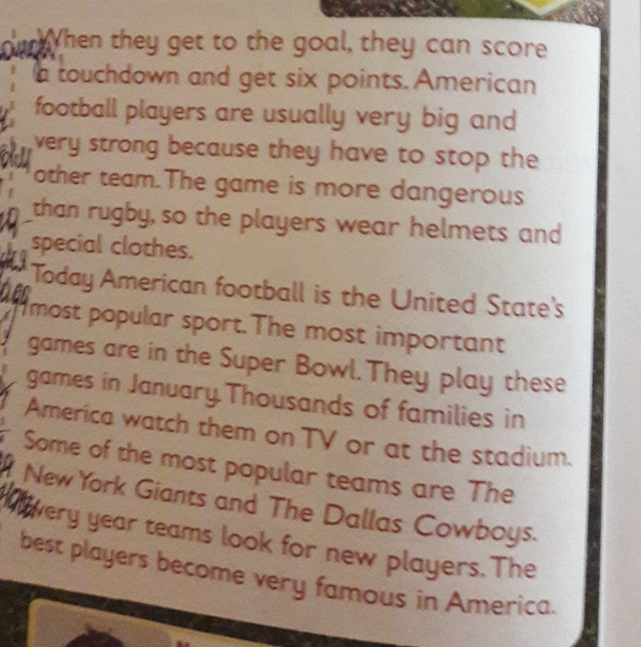 Когда они добираются до цели они могут забить приземления и получают шесть очков. Американские футболисты обычно очень большие и очень сильные, потому что им приходится останавливать другую команду. Игра более опасна, чем регби, поэтому игроки носят шлемы и специальную одежду. Сегодня американский футбол является самым популярным видом спорта в Соединенных Штатах. Самые важные игры в . Они играют в эти игры в январе. Тысячи семей в Америке смотрят их по телевизору или на стадионе. некоторые из самых популярных команд - The New York Giants и The Dallas Cowboys. лучшие игроки становятся очень популярными