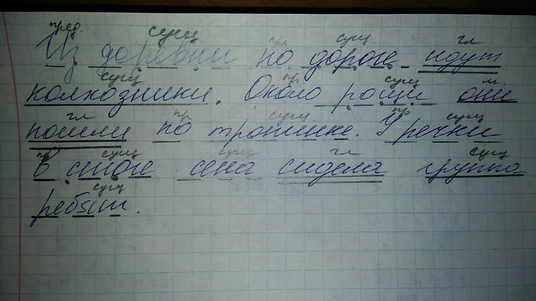 Разберите предложение по членам Укажите части речи из деревни по дороге идут колхозники около рощи они пошли по тропинке у речки в стоге сена сидела группа ребят