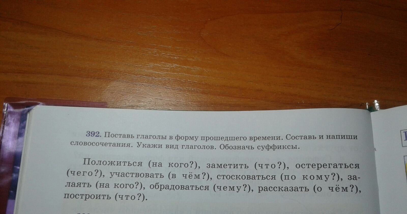 Положился на друга(сов.вид,суффикс:л,ся),заметил пропажу(сов.вид,суффикс:л),остерегался той улицы(несов.вид,суффикс:л,ся,а),участвовал в конкурсе(несов.вид,суффикс:ова,л),стосковался по бабушке(сов.вид,суффикс:ова,л,ся),залаял на соседа(сов.вид,суффикс:я,л),обрадовался сюрпризу(сов.вид,суффикс:ова,л,ся),рассказал о путешествии(сов.вид,суффикс:а,л),построил шалаш(сов.вид,суффикс:и,л).