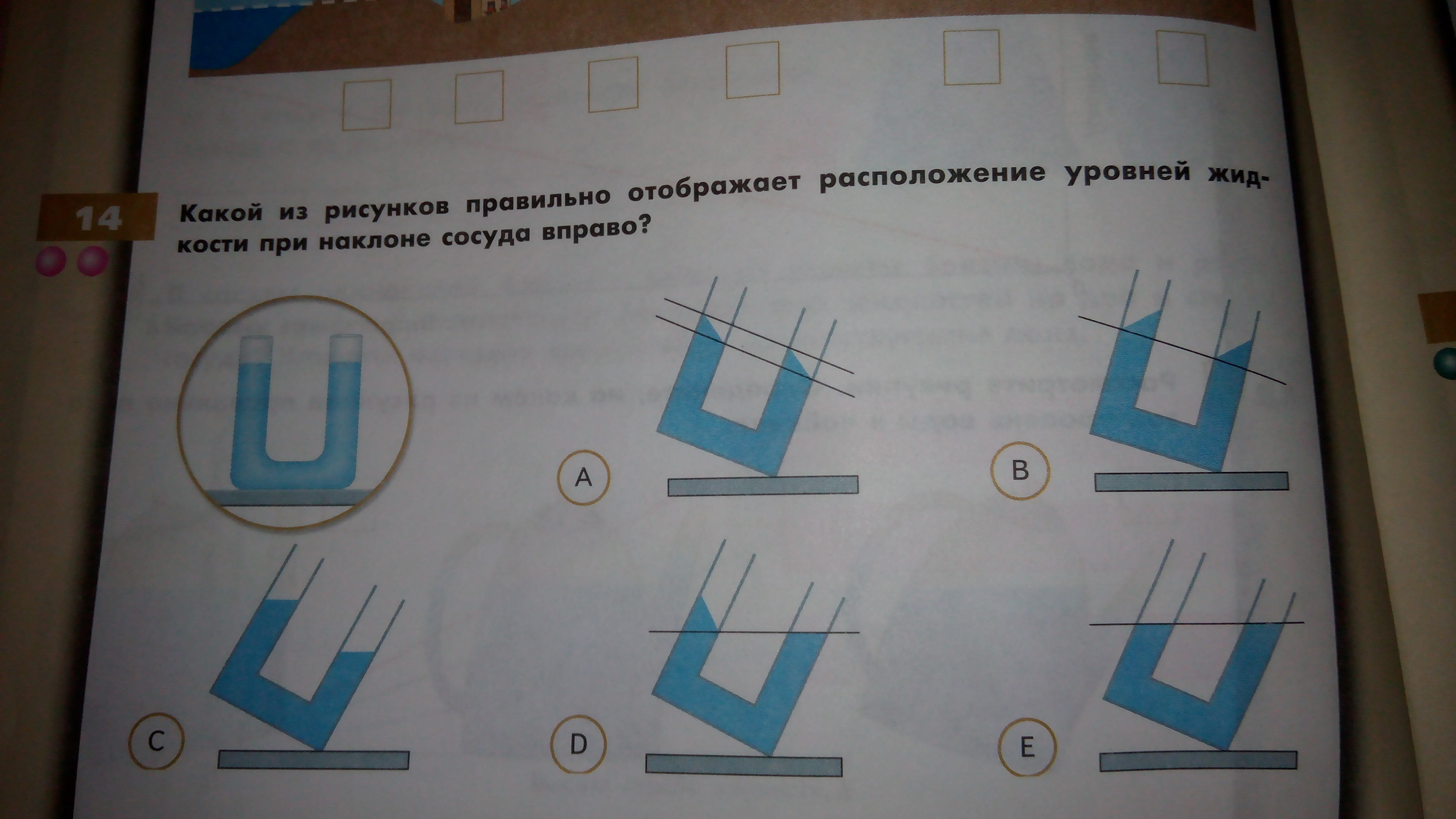 Рисунок Е, при наклонении вода из левой трубки переливается в правую, тем самым в правой трубке больше воды, чем в левой. Так же уровни правой и левой части находяться на одной прямой, так как это сообщающийся сосуд( вроде бы)