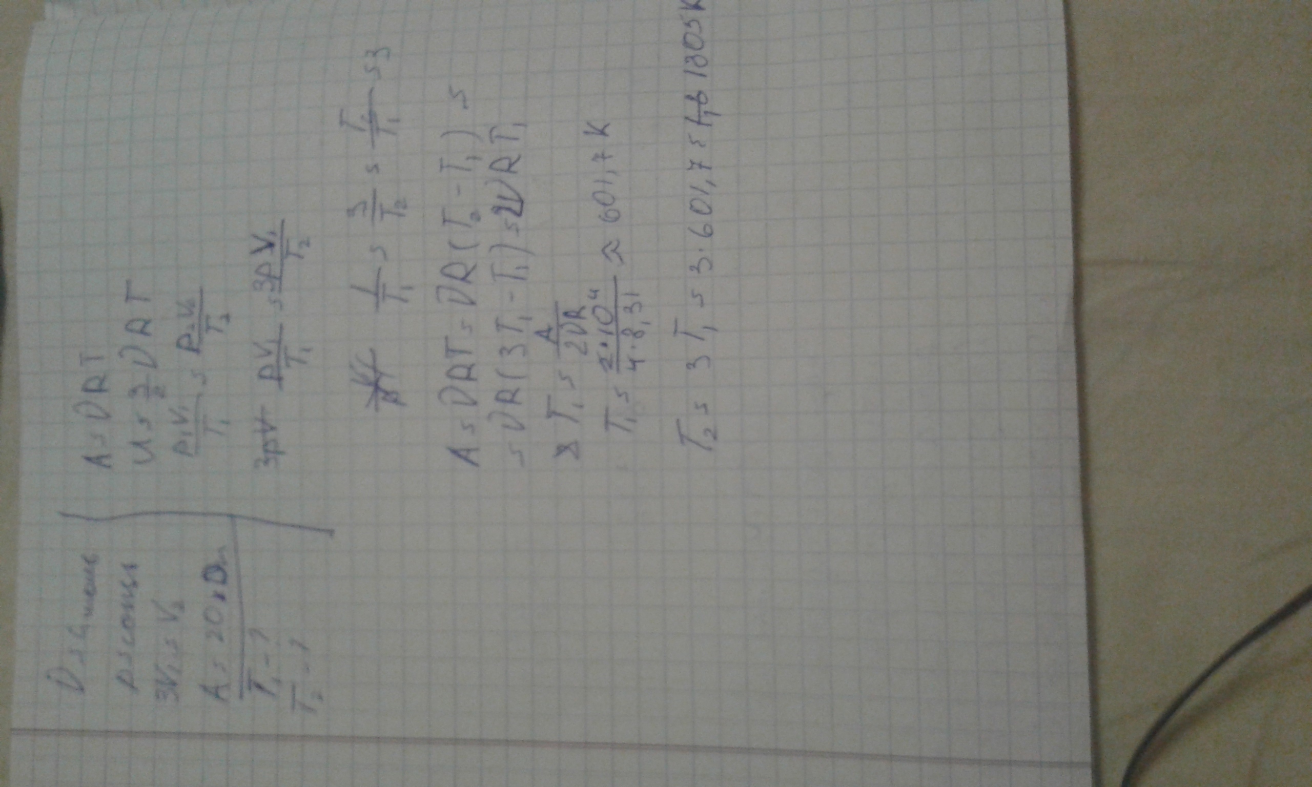 Помогите,пожалуйста! Найти начальную и конечную температуры четырех молей газа,если известно,изобарически расширившись втрое,газ совершил работу 20 кДж.